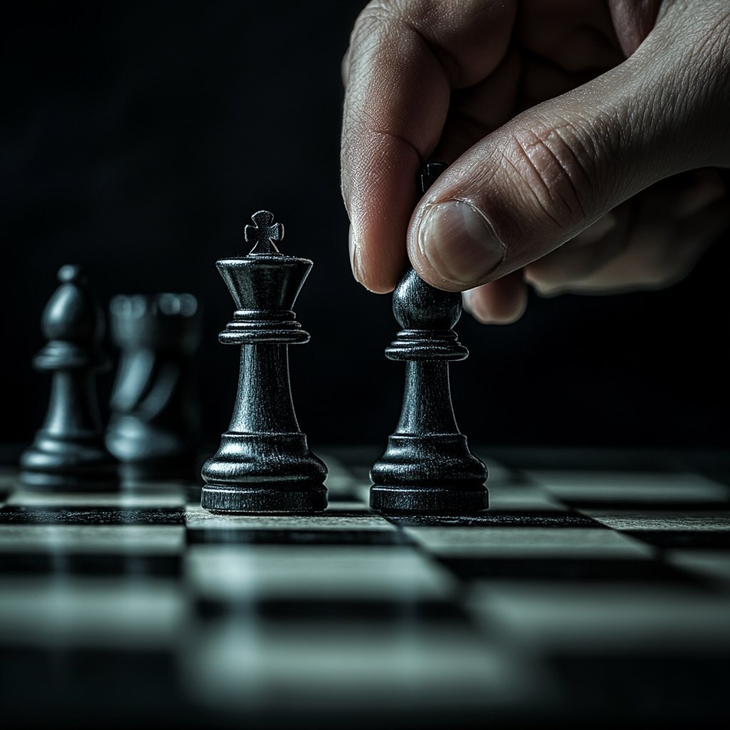 Создано на основе запроса: Chessboard with a hand moving a pawn forward while the king hides behind
