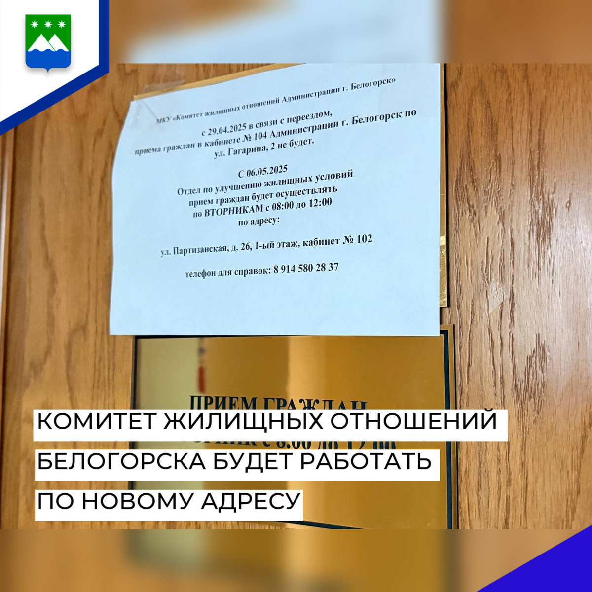 Комитет жилищных отношений Белогорска сообщает, что с 29 апреля, в связи с переездом, прием граждан в кабинете № 104 администрации города по ул. Гагарина, 2, вестись не будет. С 6 мая прием граждан будет осуществляться по новому адресу: ул. Партизанская, д. 26, 1-й этаж, кабинет № 102. Прием граждан отдела по улучшению жилищных условий будет осуществляться по вторникам с 08:00 до 12:00. Белогорцы могут обращаться по следующим вопросам: -заключения договоров социального, специализированного, коммерческого найма и внесения в них изменений; -заключения договоров передачи муниципального жилого помещения в собственность граждан; предоставления сведений о ранее приватизированном имуществе; -учет граждан в качестве нуждающихся в жилых помещениях; реализации мероприятий жилищных программ. Телефон для справок: 8 914 580 28 37.
