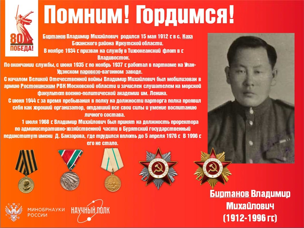⚡️Научный полк. Биртанов Владимир Михайлович Биртанов Владимир Михайлович родился 15 мая 1912 г. в с. Каха Боханского района Иркутской области. До 1930 г. учился в семилетней школе и одновременно работал в колхозе. С 1930 по 1933 г. учился в Бурятском педагогическом техникуме. По окончании техникума, был назначен директором Сарамской семилетней школы, где проработал до января 1934 г. Затем был взят на должность заместителя секретаря Кяхтинского райкома ВЛКСМ. В ноябре 1934 г. призван на службу в Тихоокеанский флот в г. Владивосток. По окончании службы, с июня 1935 г. по ноябрь 1937 г. работал в парткоме на Улан-Удэнском паровозо-вагонном заводе. В ноябре 1937 г. решением бюро ОК КПСС назначен секретарем Бурятского Цика Бурят-Монгольской АССР. С сентября 1939 по 1941 г. учился в Академии руководящих кадров Наркомхоза РСФСР в Москве. В связи с закрытием гражданских академий,поступил на работу начальником отдела пропаганды и агитации в Центральный парк культуры и отдыха им. М. Горького.