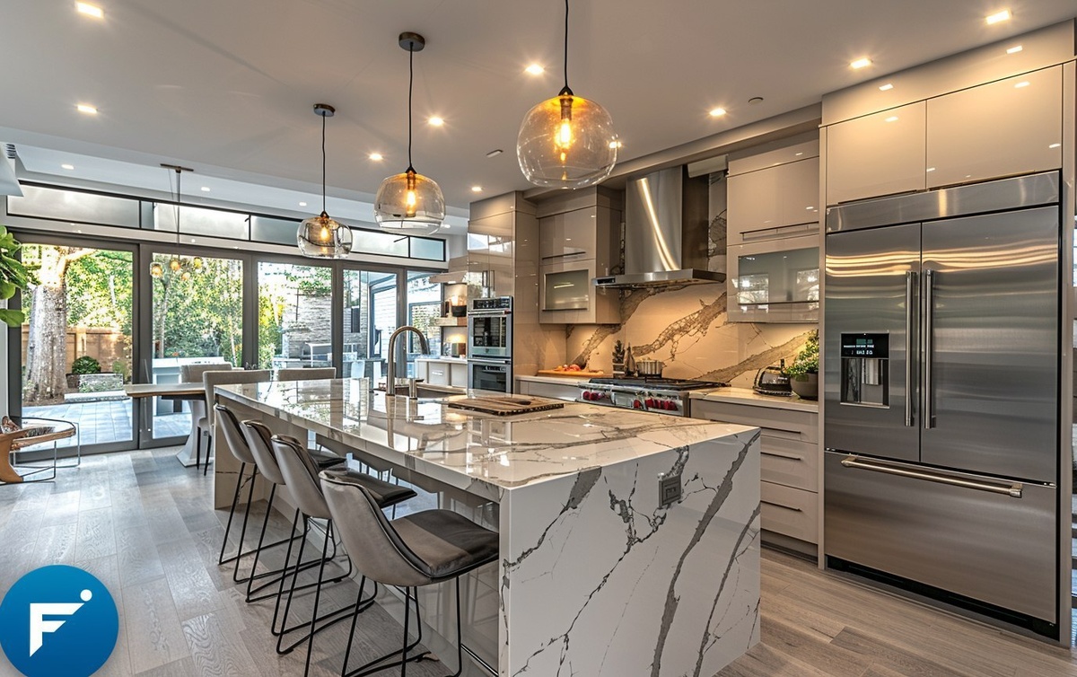 Создано на основе запроса: kitchen. The kitchen features a sleek island with a marble or quartz countertop, a stainless steel refrigerator, a high-end stove, and elegant LED lighting that highlights the cabinetry and workspace. The ambient lighting creates a warm and inviting atmosphere, with subtle reflections on the polished surfaces. The background is slightly blurred to enhance focus on the kitchen details. The composition leaves negative space on the left side, making it perfect for overlaying white text. The image should feel luxurious, aspirational, and designed to attract homeowners looking for high-end kitchen remodeling. --- Автоперевод: кухня. Что думаешь? 🤔 https://dzen.ru/id/65c0c65c86e4f837c27b24d7 #ИИ #AI #нейросеть #midjourney #art