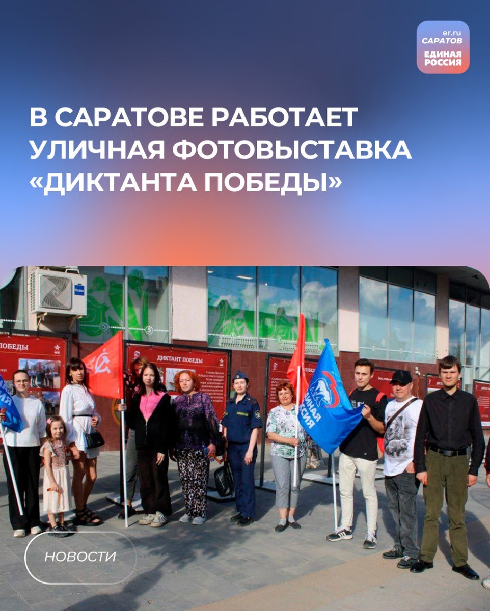 📕 Экспозиция, посвященная международной патриотической акции «Диктант Победы», создана в рамках реализации федерального проекта «Историческая память» партии «Единая Россия». Фотовыставка расположена на ул. Волжская Саратова. Включает в себя тридцать стендов с информацией об истории проведения Диктанта Победы, географии площадок, знаковых местах акции и самих участниках. Несколько стендов посвящены проведению «Диктанта Победы» в Саратовской области. Председатель Саратовской городской Думы Сергей Овсянников отметил, что «Диктант Победы» — это дань уважения ветеранам, всем тем, кто защищал страну на фронте и в тылу. 💬«Люди должны знать историю своей страны и ценить её. Особенно это важно для наших детей, молодежи. Патриотическое воспитание молодёжи, сохранение исторической правды являются ключевыми задачами «Единой России», - поделился Сергей Овсянников. Исполняющий обязанности секретаря Волжского местного отделения партии, член президиума регионального политического совета, ветера