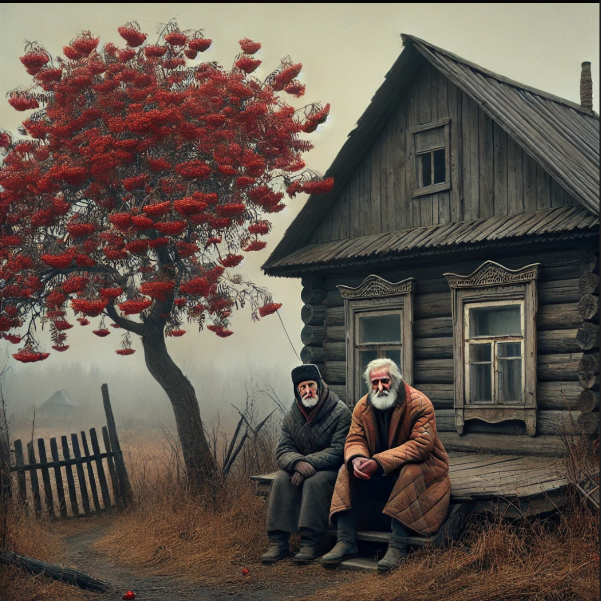 Лето стояло тихое, словно давно забытая молитва. Воздух пах мёдом и пеплом - и тем особым августовским умиранием, в котором нет трагедии, только - принятие. На крыльце сидели двое: седые, с покосившимися плечами, в фуфайках, выгоревших до серого, как выцветает в жизни - горечь, стыд, былое.