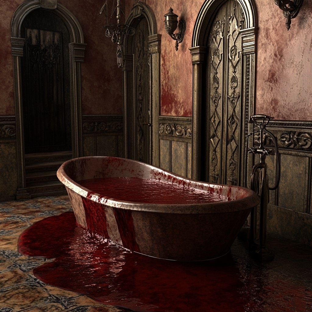 Создано на основе запроса: Medieval European bathroom: bathtub overflowing with red liquid