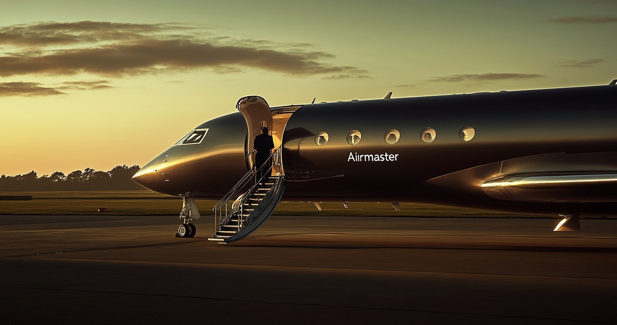 Создано на основе запроса: Photograph of the side door open on an elegant business jet parked at dawn, with passengers disembarking through