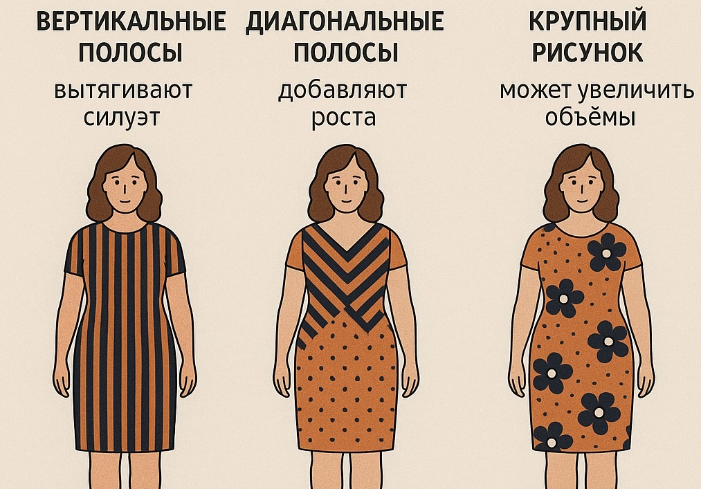 Правильно подобранный узор на ткани может визуально скорректировать пропорции, сделать фигуру более гармоничной и даже «уменьшить» или «увеличить» отдельные зоны. Вот ключевые и часто применяемые принципы выбора принтов для разных типов фигур. Для уменьшения объема: Мелкий принт (горошек, тонкая полоска, мелкий цветочный узор) Вертикальные линии – удлиняют силуэт Темные принты на светлом фоне (например, черные узоры на бежевом)