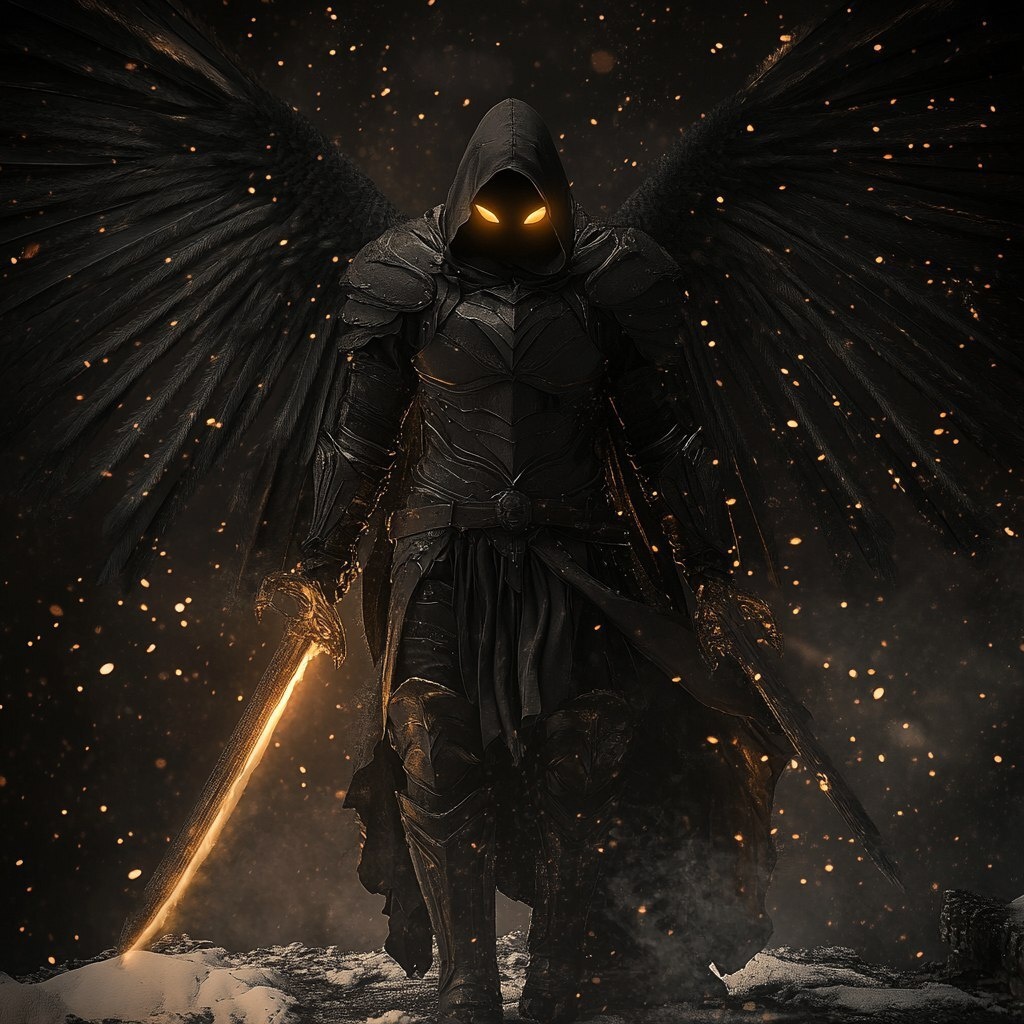 Создано на основе запроса: Dark Archangel With Fireeyes In The Black Photorealistic