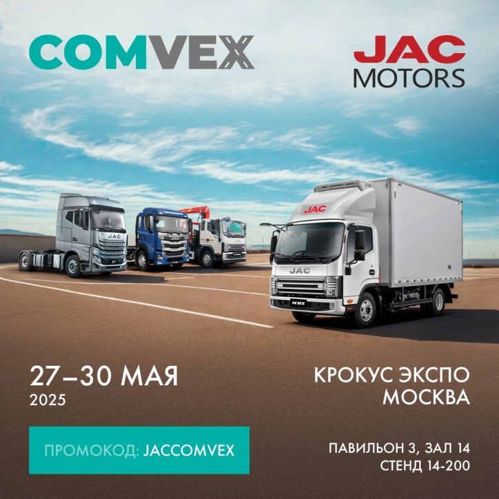 Станьте частью крупнейшего отраслевого события! ООО "Джак Автомобиль" - эксклюзивный дистрибьютор JAC MOTORS и дочерняя компания завод-производителя приглашает посетить стенд бренда JAC на Международной выставке коммерческого транспорта и технологий COMVEX 2025! С 27 по 30 мая в МВЦ «КРОКУС ЭКСПО» JAC представит новейшие решения в области коммерческого транспорта. Вас ждет знакомство с техникой, передовыми технологиями и экспертами бренда. В этом году на экспозиции более 500 м² JAC MOTORS представит 7 моделей, включая известные рынку коммерческие автомобили JAC в специальных исполнениях и новые перспективные модели. Специалисты JAC MOTORS проведут индивидуальные консультации и расскажут о возможностях техники JAC для вашего бизнеса. Павильон 3, зал 14, стенд 14-200 Промокод: JACCOMVEX *Необходимо использовать данный промокод при прохождении онлайн-регистрации на сайте организатора https://comvex.ru/. Данный промокод дает возможность зарегистрироваться Вам и Вашим коллегам неограни