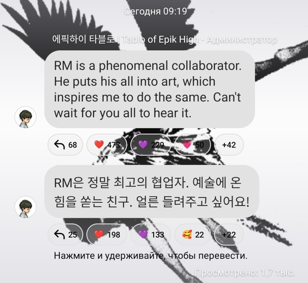 RM — потрясающий соавтор. Он вкладывает в искусство всю душу, и это вдохновляет меня делать то же самое. Не могу дождаться, когда вы всё это услышите.