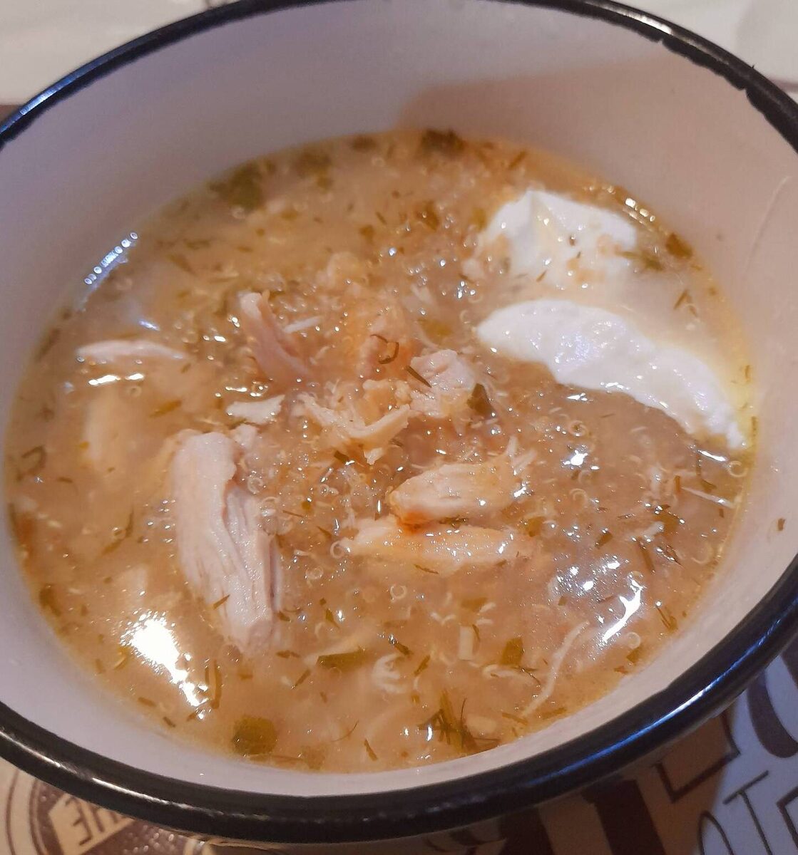 Доведите бульон до кипения, запустите обжаренную курицу и киноа, лавровый лист, рубленую петрушку и сок лимона.