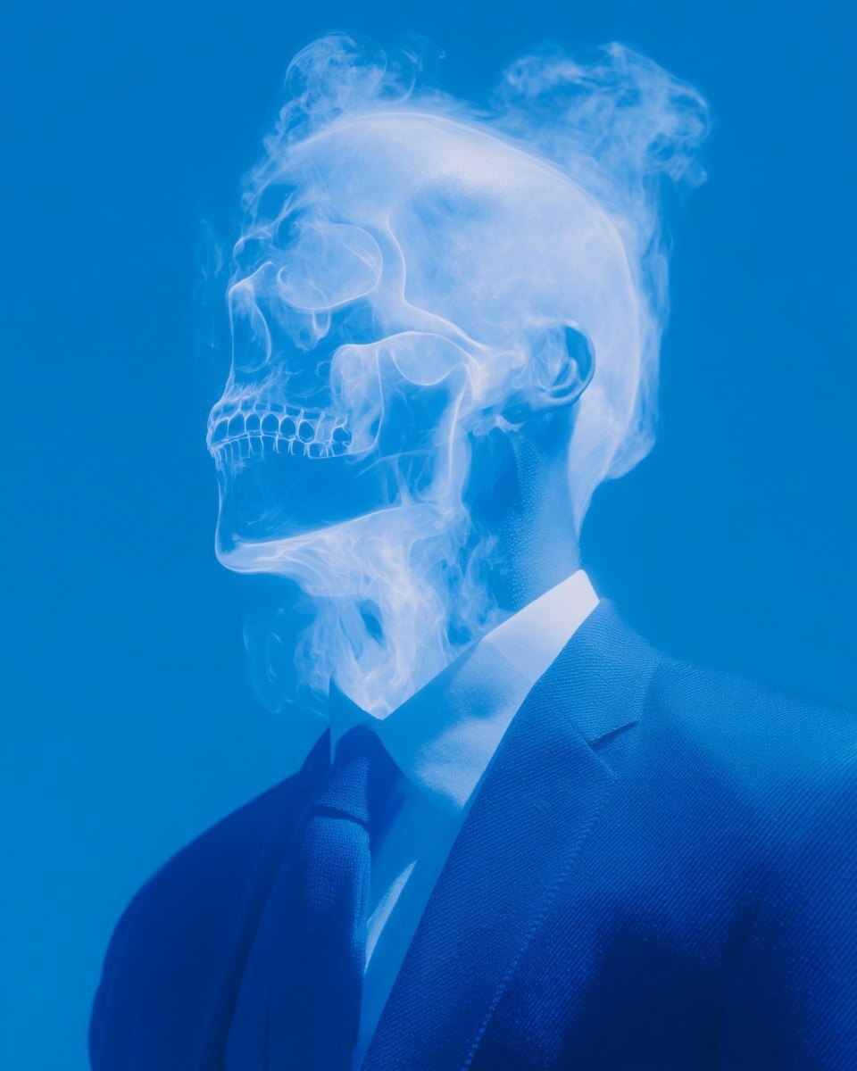 Создано на основе запроса: Portrait: a suit, a skull make from blue smoke