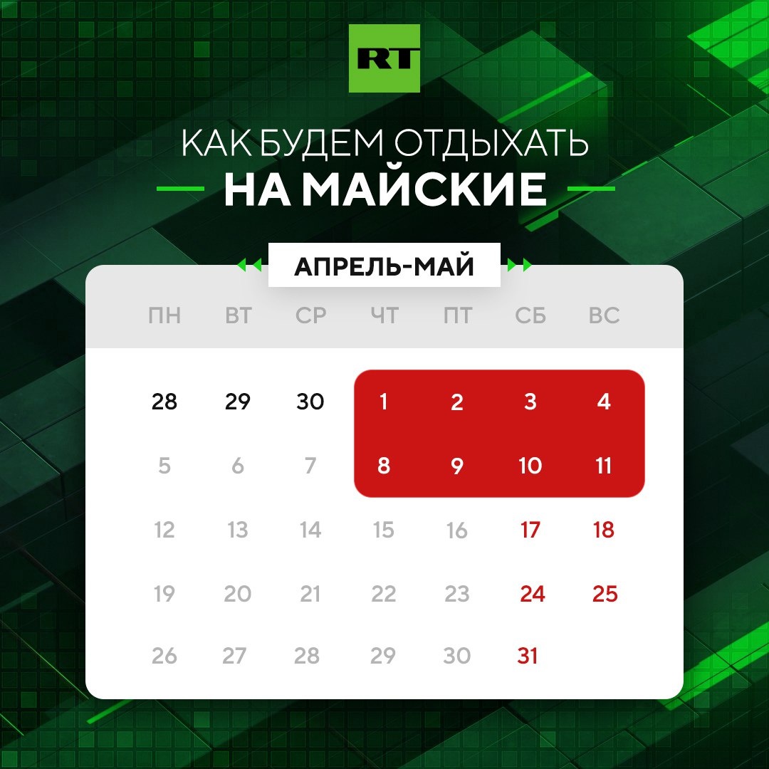 Выходные продлятся с 1 по 4 и с 8 по 11 мая.