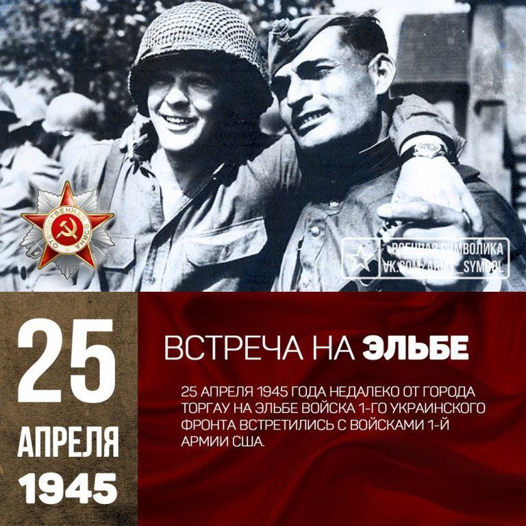 Этот день в истории. 25 апреля 1945 года недалеко от города Торгау на реке Эльба войска 1-го Украинского фронта армии СССР встретились с войсками 1-й армии США. В 15:30 передовые части 58-й гвардейской стрелковой дивизии встретились с разведчиками американской 60-й пехотной дивизии. Первая встреча состоялась в 13:30 того же дня в 5 км от Ризы. Она произошла между 6-й стрелковой ротой под командованием старшего лейтенанта Г.С. Голобородько и разведчиками 69-й пехотной дивизии 5-го пехотного корпуса 1-й американской армии во главе с лейтенантом Альбертом Котцебу.