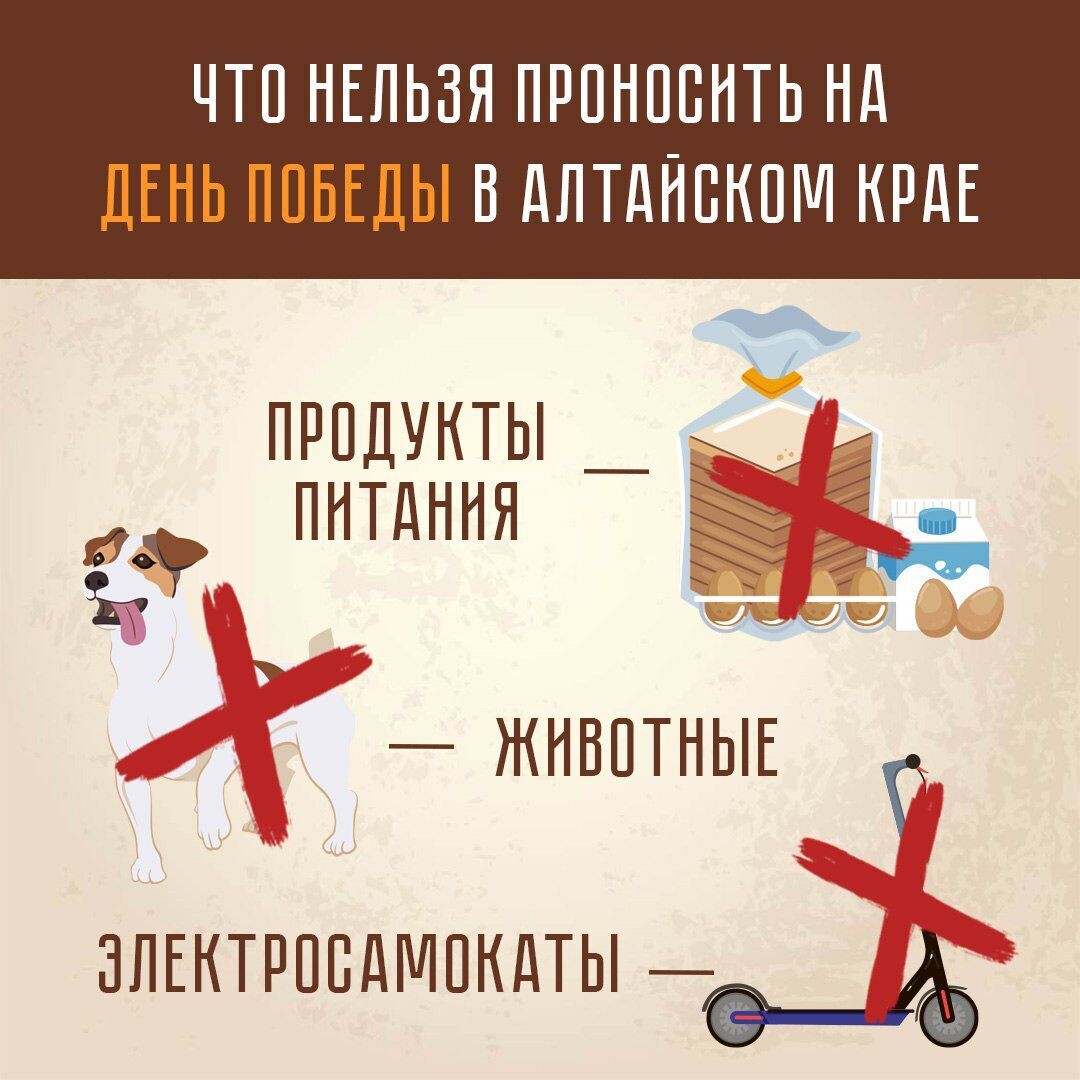 В Алтайском крае опубликован перечень предметов, запрещенных на мероприятиях, посвященных 80-й годовщине Победы в Великой Отечественной войне ❗️ В первую очередь, вопрос касается безопасности. В перечень вошли, например, лекарственные препараты без медицинской справки, вейпы, огнеопасные пиротехнические вещества и изделия, портативные устройства для зарядки техники, велосипеды, электросамокаты, контейнеры для продуктов, бутылки и банки, все виды жидкостей, аэрозоли, беспилотные летательные аппараты, воздушные шары и воздушные змеи. ✔️ Полный список предметов, запрещенных к проносу (провозу) в охраняемые зоны во время праздничных мероприятий 9 мая: https://altairegion22.ru/upload/DOC/doc/perechen_may2025.docx
