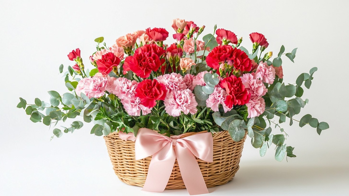 Создано на основе запроса: A beautiful flower basket filled only with red and pink carnations, arranged harmoniously with green eucalyptus
