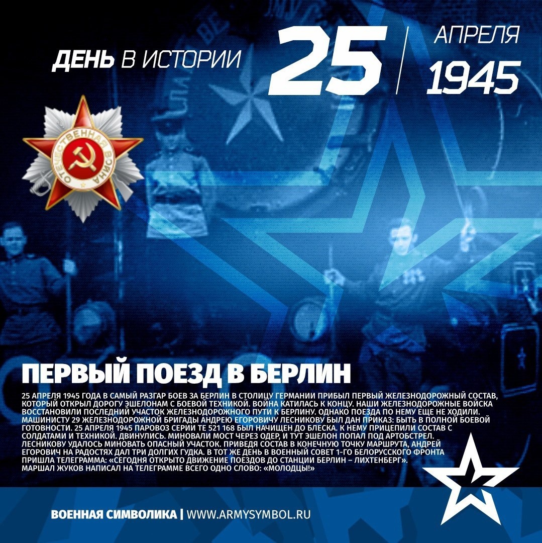 Первый поезд в Берлин в 1945 25 апреля 1945 года в самый разгар боев за Берлин в столицу Германии прибыл первый железнодорожный состав, который открыл дорогу эшелонам с боевой техникой. Война катилась к концу. Наши железнодорожные войска восстановили последний участок железнодорожного пути к Берлину. Однако поезда по нему еще не ходили. Машинисту 29 железнодорожной бригады Андрею Егоровичу Лесникову был дан приказ: быть в полной боевой готовности. 25 апреля 1945 паровоз серии ТЕ 521 168 был начищен до блеска. К нему прицепили состав с солдатами и техникой. Двинулись. Миновали мост через Одер, и тут эшелон попал под артобстрел. Лесникову удалось миновать опасный участок. Приведя состав в конечную точку маршрута, Андрей Егорович на радостях дал три долгих гудка. В тот же день в военный совет 1-го Белорусского фронта пришла телеграмма: «Сегодня открыто движение поездов до станции Берлин Показать полностью... Подпишитесь на наши группы ВКонтакте и в Одноклассниках - читайте, смотрите и к