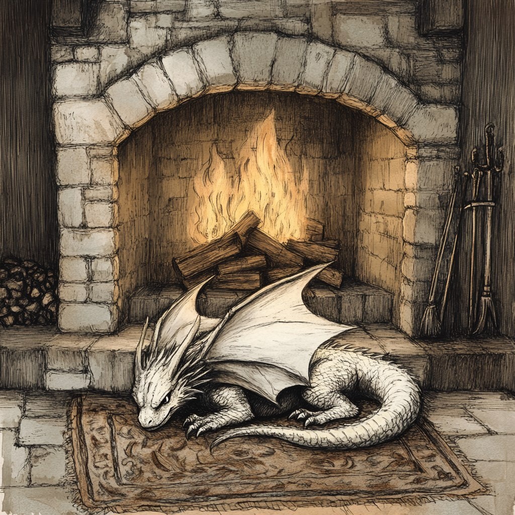 Создано на основе запроса: curled up on small rug long tail skinny dragon wings claws near rustic fireplace scribble style sketch