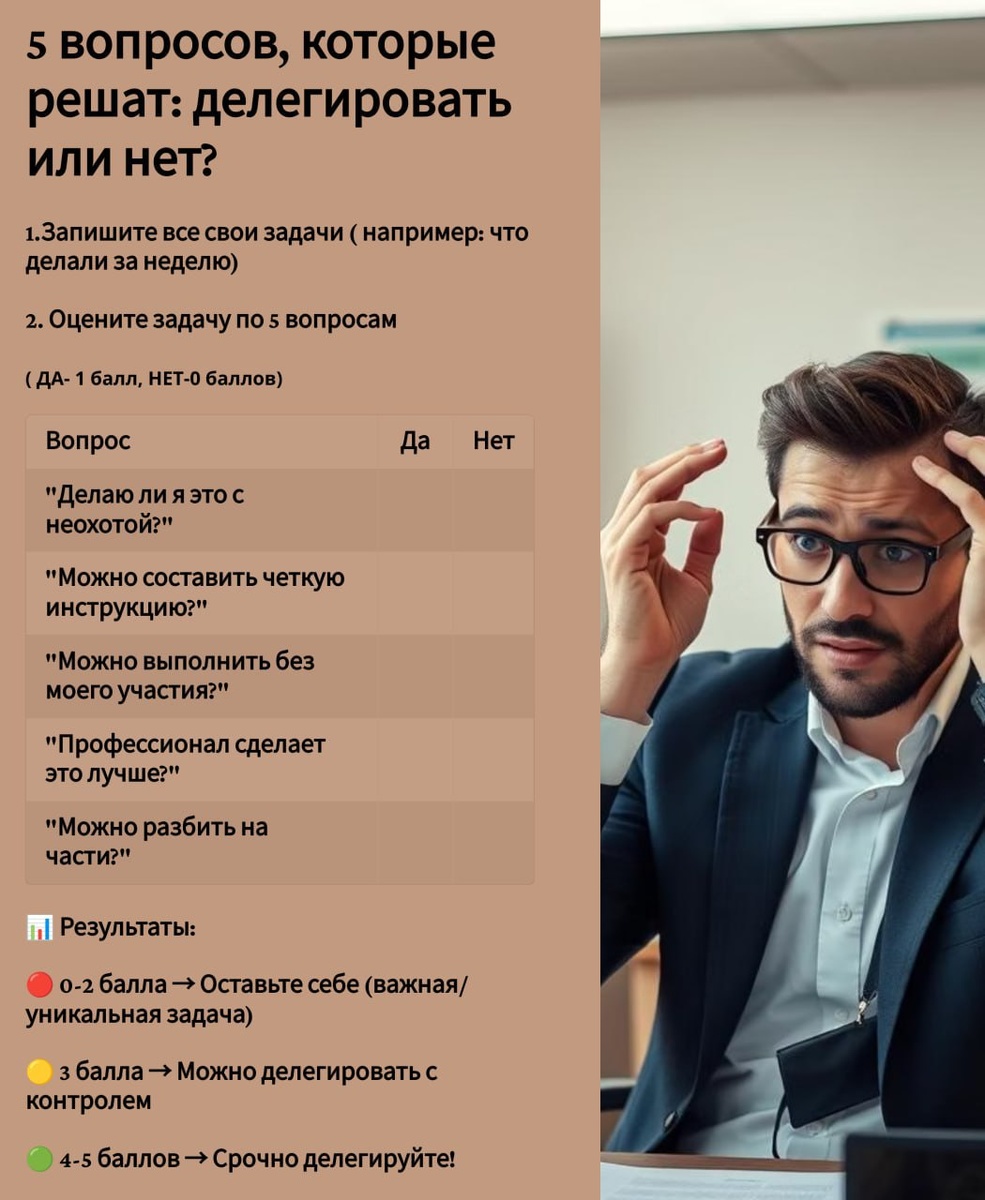 ➿➿➿➿➿➿➿➿➿➿➿➿➿➿➿➿➿➿ ТЕСТ: КАКИЕ ЗАДАЧИ СРОЧНО НУЖНО ДЕЛЕГИРОВАТЬ? ➿➿➿➿➿➿➿➿➿➿➿➿➿➿➿➿➿➿ (Тест для предпринимателей, которые хотят освободить время и зарабатывать больше) ➡️ Инструкция: 🔢Выпишите все свои задачи за неделю 🔢Проверьте каждую по 5 вопросам (Ответ ДА 1 балл/НЕТ- 0 баллов) 🔢Посчитайте баллы и получите готовый ответ: Результат: 🔴 0-2 = Ваша уникальная задача 🟡 3 = Дел