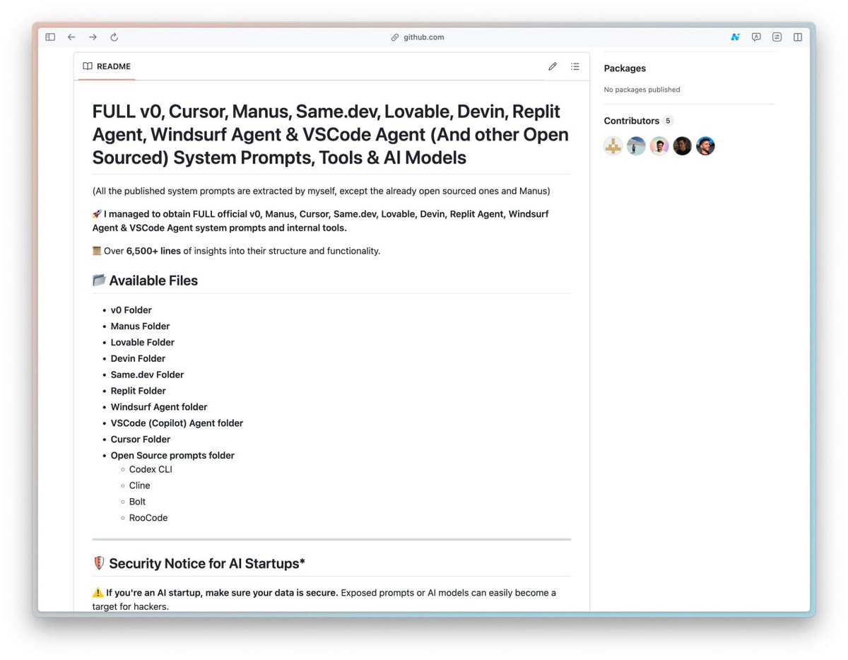 Создаем собственного AI-программиста: в открытом доступе представлено 6500 строк системных промтов для Cursor, v0 и других инструментов генерации кода. В этом наборе содержатся ценные промты для чат-ботов, а также примеры ролей и корректные инструкции для разработки разнообразных приложений. Мы фиксируем эти ресурсы. Наш уютный канальчик 🤖 Анимация | СhatGPT-4 | Помощь с резюме