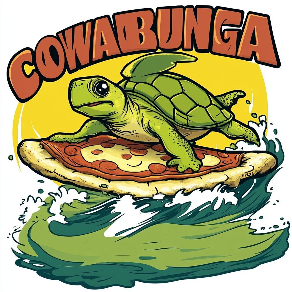 Создано на основе запроса: logo of pizza box "cowabunga pizza" a cartoon of a turtle surfing on a pizza slice