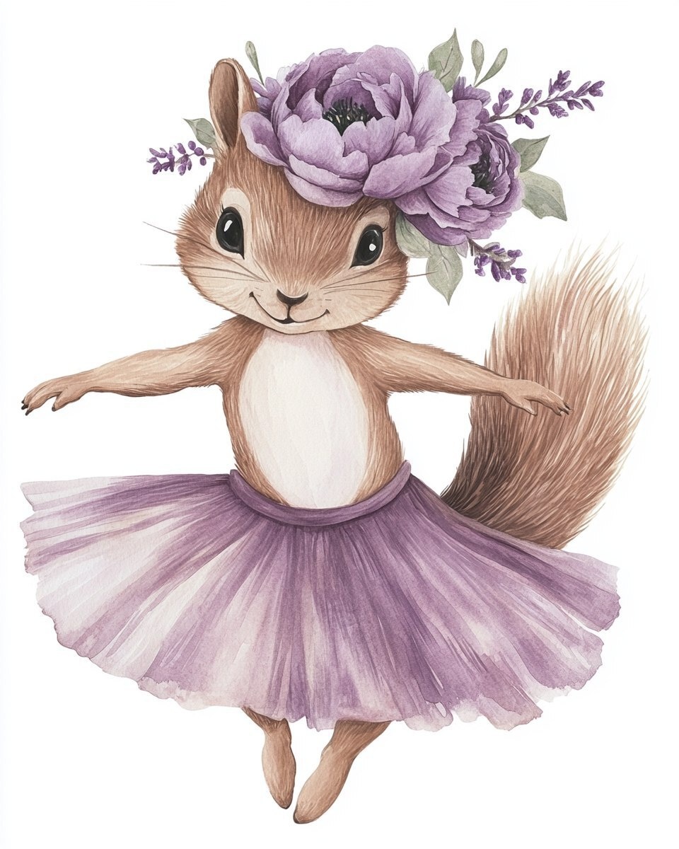 Создано на основе запроса: watercolor cute squirrel ballerina illustration, with lavender color ballet dress, with lavender color peonies on