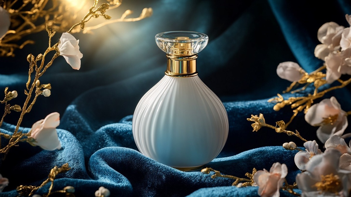 Создано на основе запроса: White plain perfume bottle displayed on rich blue velvet fabric, golden spotlight shining on the bottle, glowing