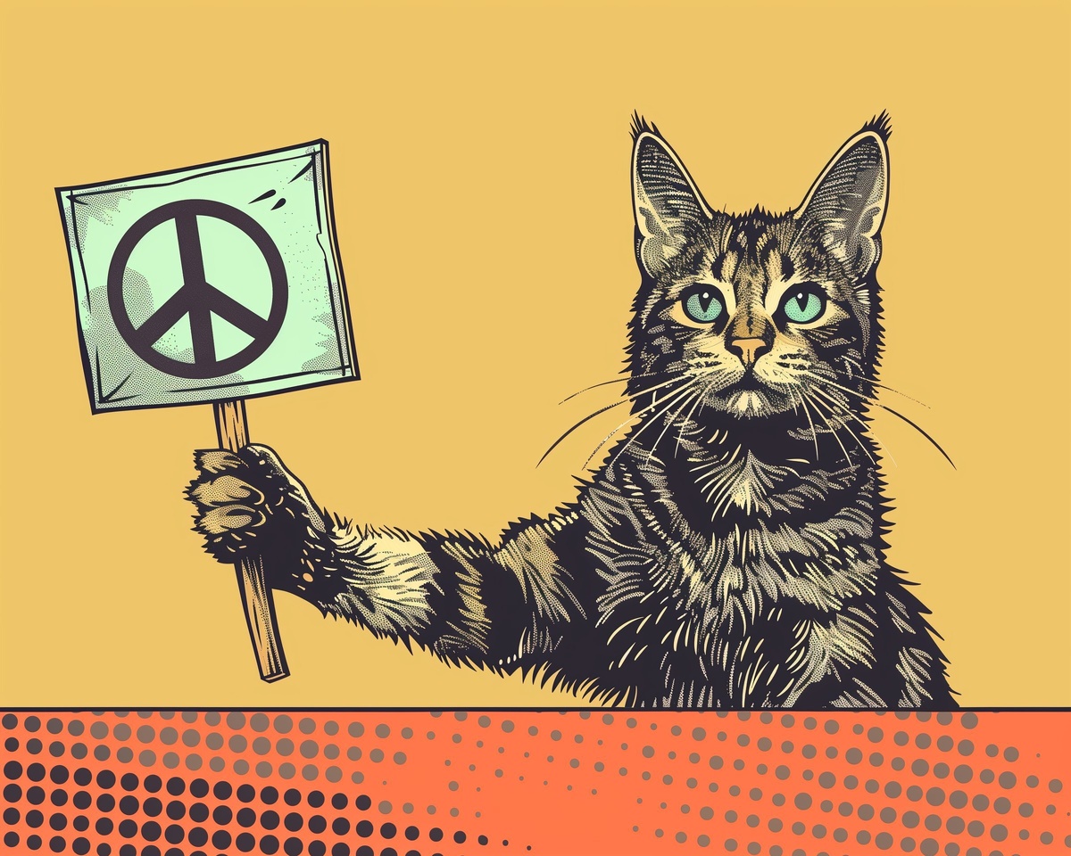Создано на основе запроса: a cat holding up a sign with the peace symbol on it, in the style of 1950s pop art, halftone illustrations, white