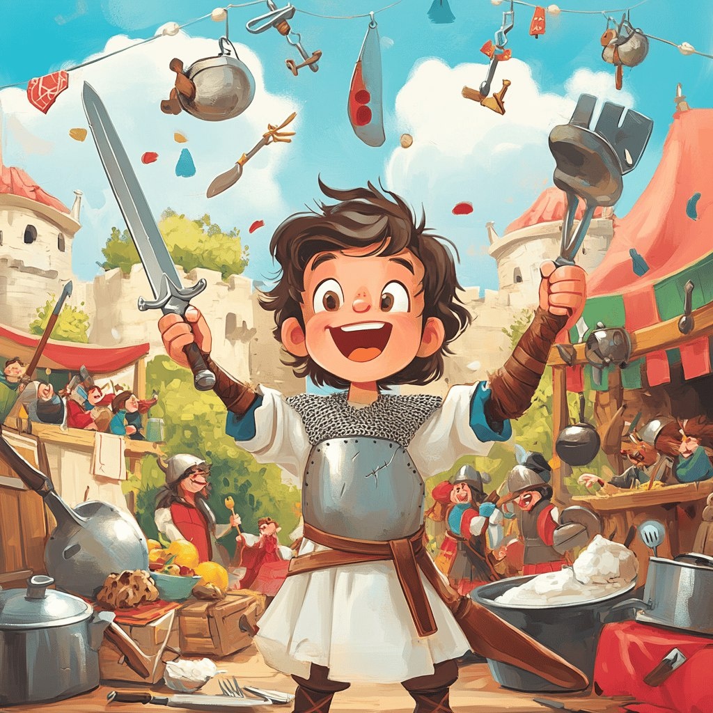 Пока принц репетировал речь перед зеркалом («Народ! Я сокрушу всех, как… э-э… гроза с горчицей!»), Готье шнырял по кухне. В ход пошли: кочерга (клинок), крышка от котла (щит), связка ложек (рукоять) и полкило воска (чтобы не развалилось). Получилось… странно. «Хоть бы не развалилось при первом ударе», — молился паж. Глава 3: «Турнирный провал (или триумф?)»