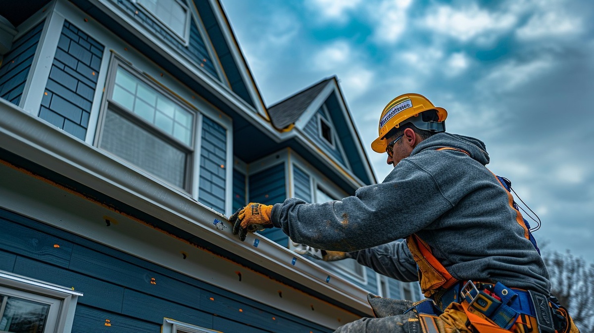 Создано на основе запроса: Close-up of construction worker installing modern vinyl siding on a suburban house, wearing branded