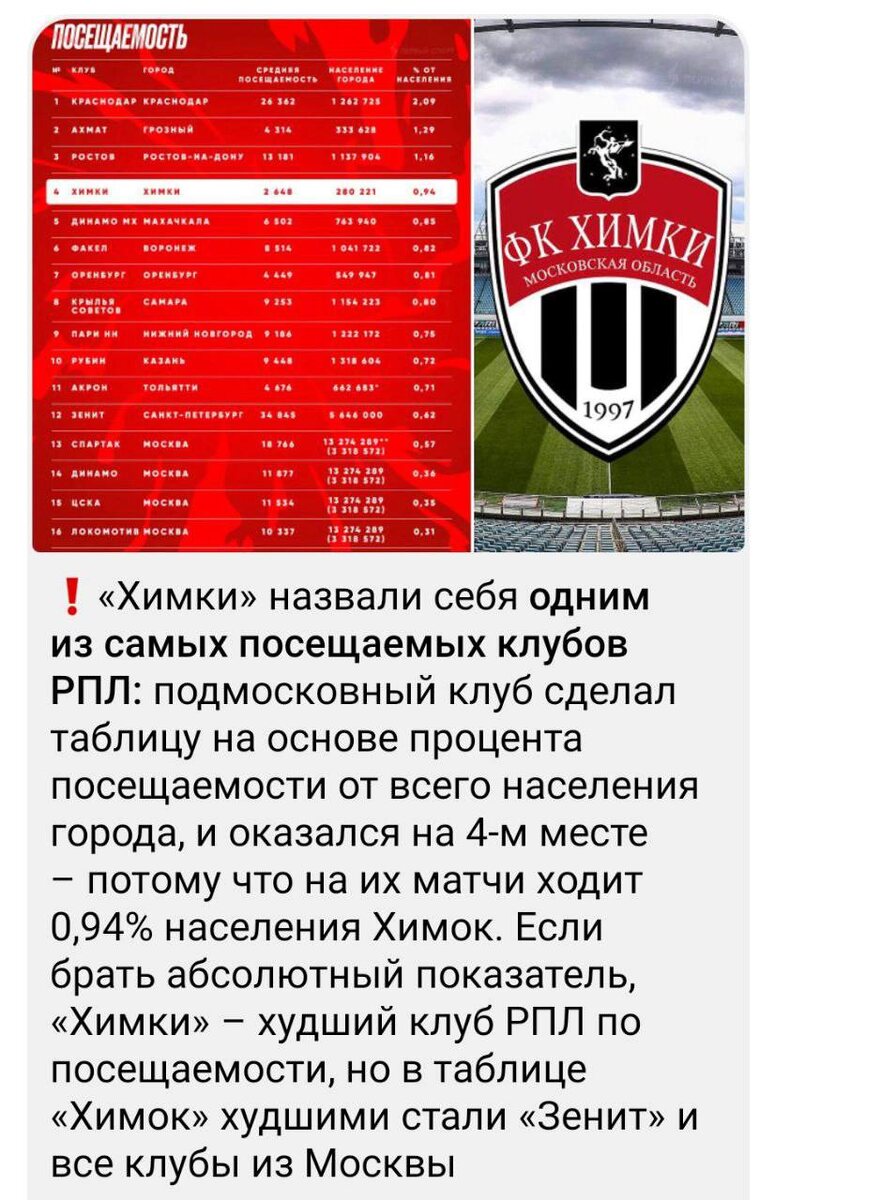 Ну какие же гении работают в «Химках». Статистика вещь упрямая, но вертеть ее можно, как умелый жонглер в цирке. Поднимать себя в списке, самими же придуманном, чтобы неким образом показать, что на «Химки» ходит чуть менее 1% от всего населения города? Почему бы и нет. А давно ли вы смотрели матчи «Химок»? Ну против топовых соперников да, там собираются зрители, чтобы посмотреть, но на остальные матчи приходит гораздо меньше людей, чем указано в среднем значении ~ 2 600 человек. Ведь и здесь статистика играет свою роль, когда на один матч придет пара сотен человек, а на матч против «Зенита» Или «Спартака» соберется практически аншлаг. А как еще «Химки» делают видимость нужности команды городу и области? Продают билеты на ту трибуну, которая попадает в тв картинку. Если вы придете на матч, то увидите, что трибуна напротив - пустая. Но если ориентироваться на систему подсчетов «Химок», тогда я мечтаю, чтобы в РПЛ вышла «Чайка», а потом лидировала в этом списке с 30% (население Песча