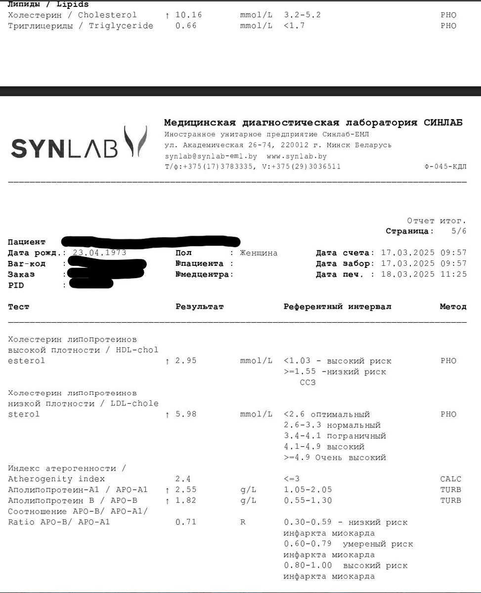 Анализы и УЗИ артерий шеи моей пациентки. Возраст 52 года. Рост 163, вес 57-59кг. Артериальное давление в норме. Самочувствие хорошее... Питается 2 раза в день, ест животные и растительные продукты. За последний год потеряла около 4х кг. Сосуды в полном порядке... Хотя в таком возрасте у женщин, ведущих образ жизни с лишним весом и курением уже будет атеросклероз.... Такое вижу регулярно, поэтому и возникает вопрос: "Насколько опасен холестерин и остальные фракции в контексте отсутствия вредных привычек и здорового метаболизма"