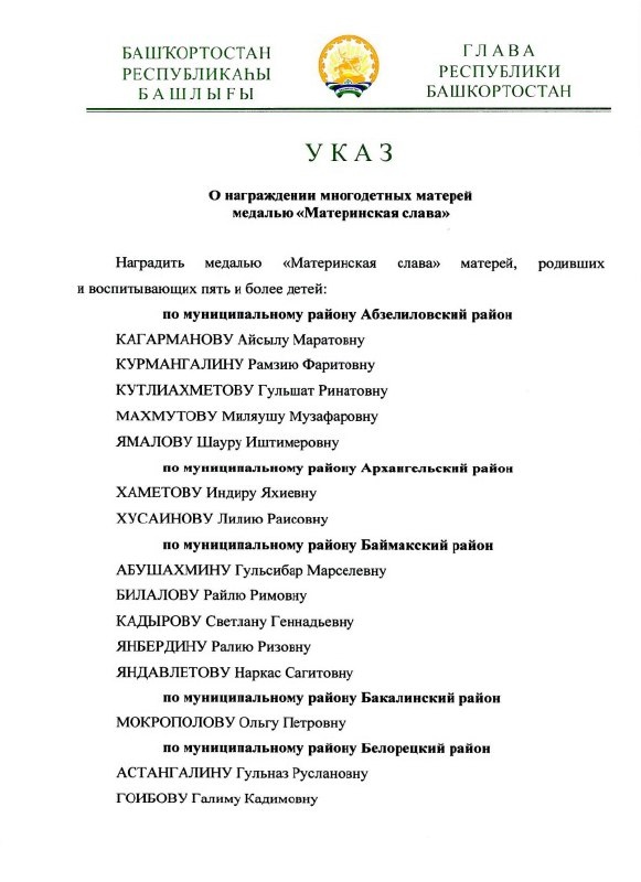 🎖️ Глава Башкортостана Радий Хабиров подписал указ о награждении многодетных матерей медалью "Материнская слава". Из Баймакского района этой награды удостоились пять женщин.