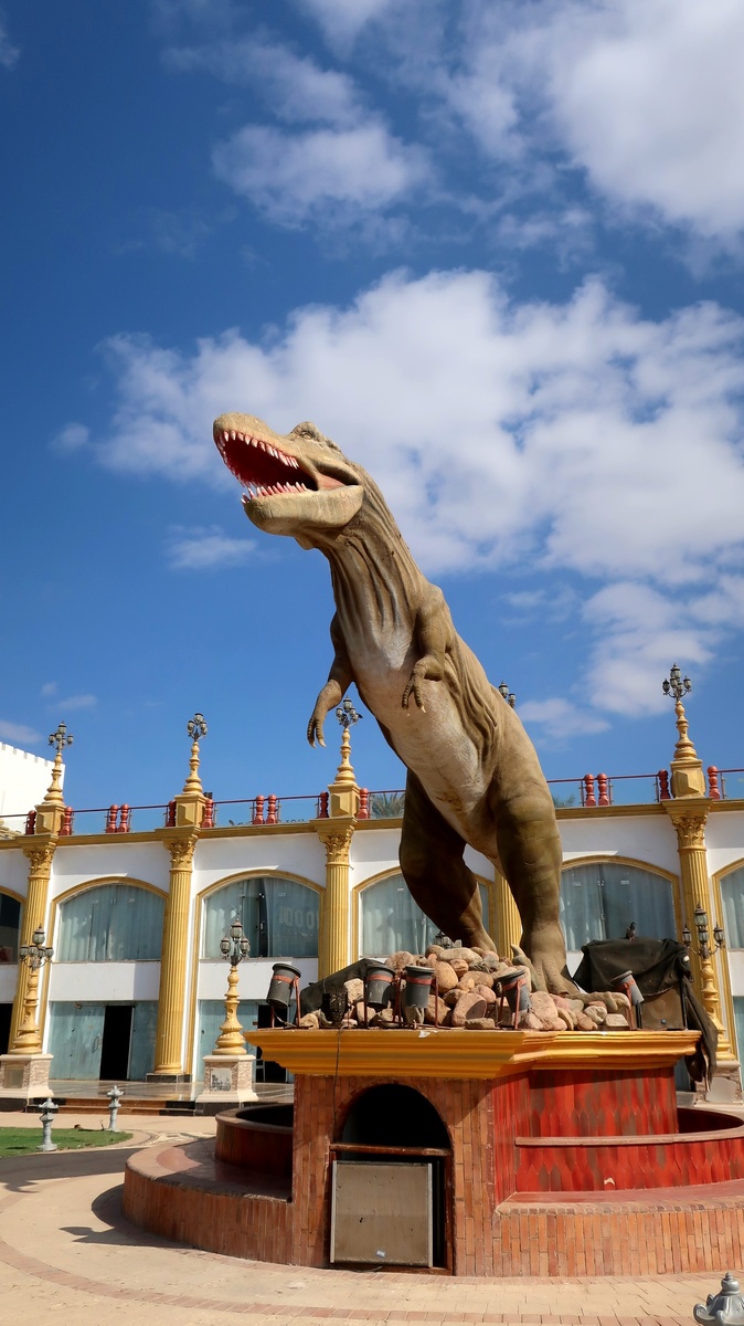 Пешком от нашего отеля минут 30. В интернете читала, что это вауууу парк — парк динозавров, кинотеатры, шоу фонтанов, торговля. Но к сожалению уж несколько лет этот парк заброшен. Но мы ребенку обещали показать динозавров, и решили сходить, посмотреть, что случилось с парком на самом деле. Парк находился около отеля Hollywood palma de sharm. От парка на входе осталось 2 больших динозавра, бассейн, где наверно проходило шоу фонтанов, закрытые лавки.