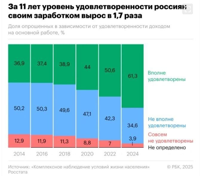 Уровень доходов, как и настроение россиян, продолжает расти.🫥 В 2024 году доля россиян, которые были полностью удовлетворены своим заработком на основной работе, достигла рекордного уровня в 61,3%. Это самый высокий показатель за последние 11 лет! Такие данные были получены Росстатом в ходе комплексного наблюдения условий жизни россиян, которое проводится раз в два года. 💡По сравнению с предыдущим выпуском наблюдения, проведённым в 2022 году, этот показатель увеличился на 10,7 процентного пункта. В то время только 50,6% граждан выражали удовлетворённость своими доходами на работе. ✅Удовлетворение растет по всем аспектам ➡️Условия труда: 83,5% опрошенных остались довольны (в 2022 году этот показатель составлял 79,8%). ➡️Обязанности: 81,1% выразили удовлетворение от своей работы (ранее — 80,7%). ➡️Надежность работы: 80,2% считают её высокой, что на 1,2% больше, чем в предыдущем докладе. ➡️Профессиональная удовлетворенность: выросла до 74,6% (ранее — 72,9%). ➡️Моральное удовлетворени
