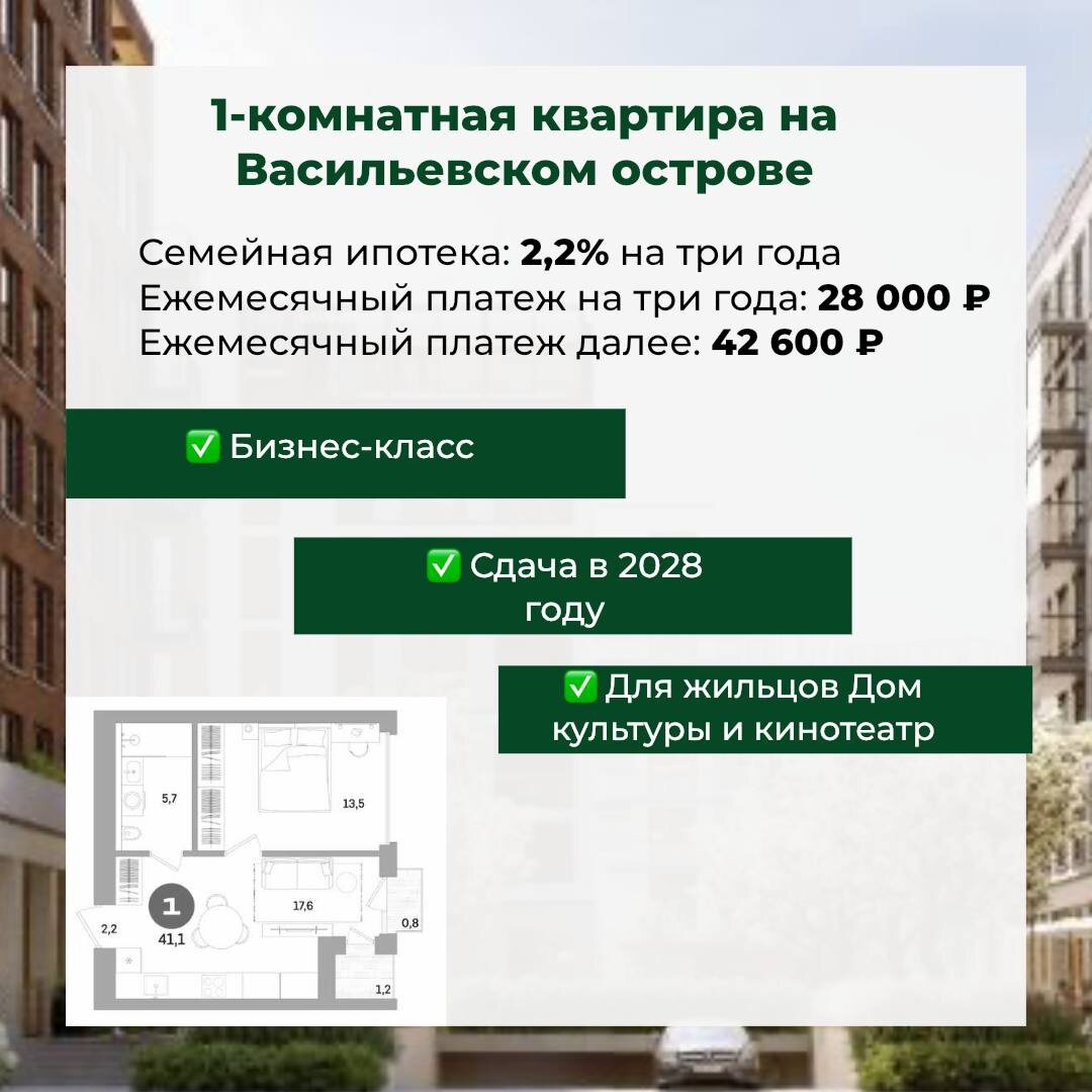 1-комнатная квартира на Васильевском острове в ипотеку от 28 000 ₽ в месяц 🔥 Такие лоты быстро разбирают — из-за локации, условий и формата жизни. Новый жилой квартал бизнес-класса на побережье Финского залива, сочетающий комфорт городской жизни с уникальной природной атмосферой. Что важно: — Квартал с дизайнерскими лобби, террасами на крышах, школой, детским садом, арт-пространствами и кафе. — На территории — зелёные дворы без машин, прогулочные аллеи и виды на воду. — Подходит для жизни или аренды. Условия покупки: Семейная ипотека — 2,2% на три года Ежемесячный платёж на три года — 28 000 ₽ Далее — 42 600 ₽. Если интересно узнать подробнее и посмотреть другие квартиры — можно написать мне ⬅️