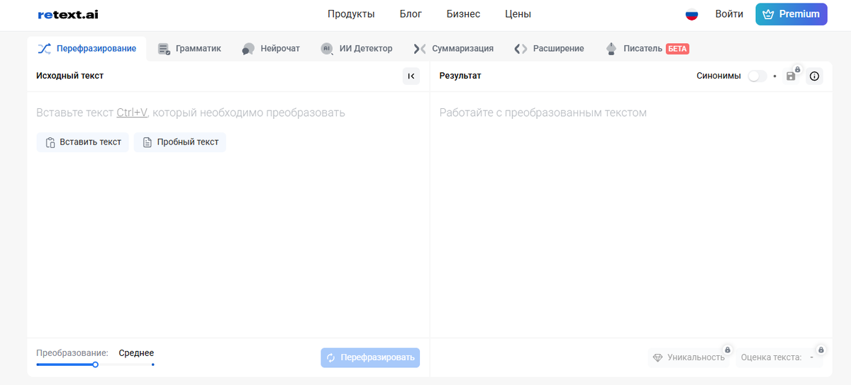 Наткнулся на этот инструмент случайно, когда искал способ обойти детекторы ИИ. ReText.AI — это не просто очередная нейросеть для перефразирования текста, а целый комбайн с продвинутыми алгоритмами.