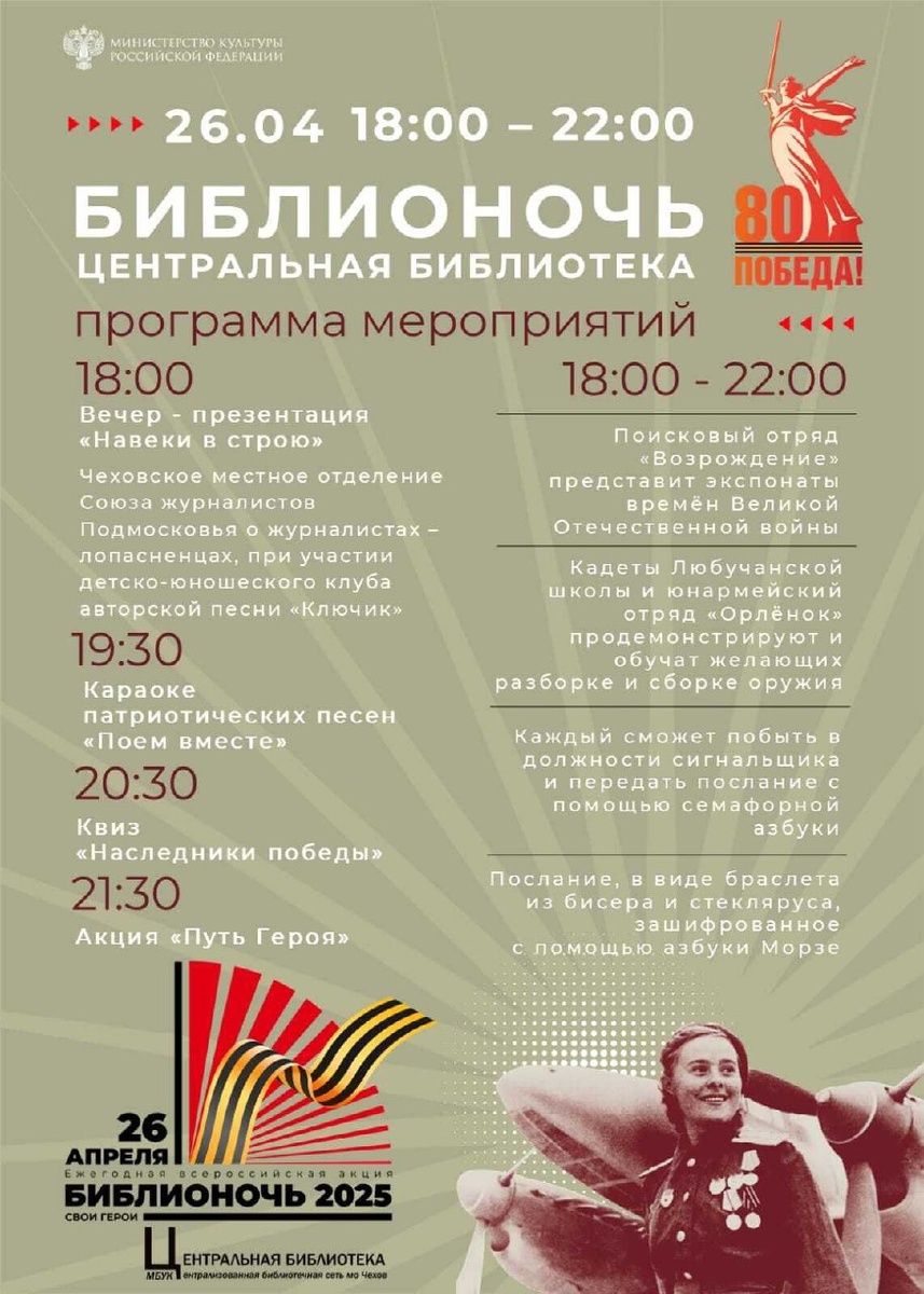 ✨ «Библионочь — 2025» 🎶🪖Вас ждёт вечер-презентация «Навеки в строю», акция «Путь героя», караоке патриотических песен и квиз. ⁉️Молодежь смогут почувствовать себя разведчиками и передать послание с помощью семафорной азбуки или создать браслет из бисера, в котором сообщение будет зашифровано с использованием азбуки Морзе. 🚫 Возраст: 6+ 📆 26.04.2025 🕛 18:00 🏢 Центральная библиотека 📍 г. Чехов, ул. Лопасненская, д.10 🪙 Вход свободный❗️ #webЧехов ✅ Мероприятия Чехов https://dzen.ru/id/66cc4b48e9ef144699238a51 http://vk.com/chekhov_events http://dzen.ru/chekhov_events