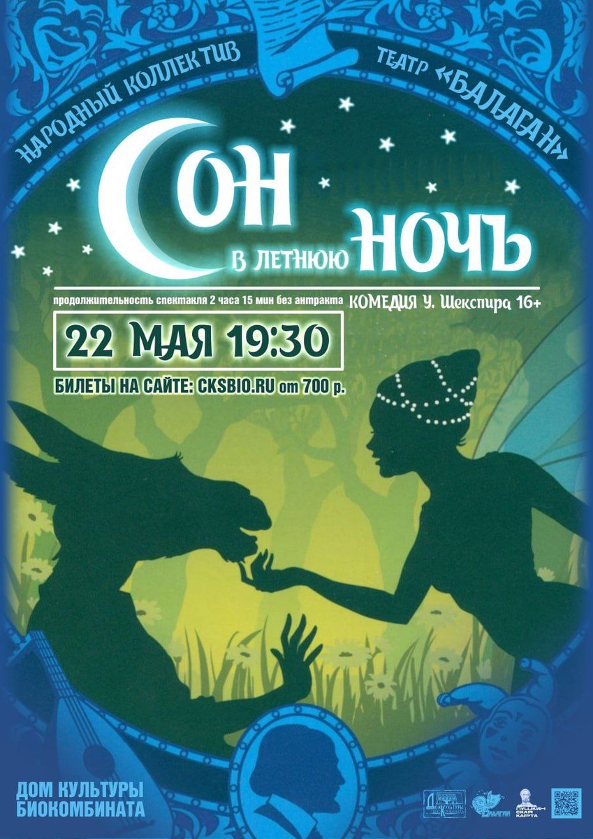 🌒 😘😉🙃 😄 ♦️ 😇🥹😗🙃🥸🥸 🙃😉😝🤨 🎟 доступно по ПУШКИНСКОЙ КАРТЕ 💳 🗓 22 мая в 19:30, Дом культуры Биокомбината Дорогие друзья! Мы рады пригласить вас на новую интерпретацию бессмертной комедии Уильяма Шекспира, которая продолжает волновать сердца зрителей на протяжении столетий. Эта история заставляет нас задуматься о природе любви, власти и человеческих взаимоотношений, которые актуальны и сегодня. Народный театр «Балаган» подготовил для вас яркое и красочное зрелище, полное оригинальных костюмов, захватывающей музыки и потрясающей игры актёров. Погрузитесь в сказочный мир, где реальность переплетается с магией, любовь с обманом, а сон с явью. 🎟 Билеты уже в продаже! Спешите занять своё место в зрительном зале! ✨