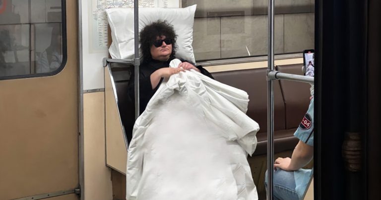 У москвичей, которые имеют привычку спать в метро, есть определенные приметы: во-первых, они крепко держатся за сумку или рюкзак, а во-вторых, иногда открывают глаза, оценивая обстановку вокруг и желая убедиться, что не проехали свою станцию, и снова закрывают. А по тем, кто в солнцезащитных очках, и вовсе не поймешь, спят они или нет. Не всем, конечно, комфортно спать на твердых сиденьях, но есть, как говорится, люди, которые и в лесу обустроят себе домашнюю обстановку, как сделала пассажирка с черными кудрявыми волосами. Подложив под голову подушку, накрывшись одеялом и надев темные очки, можно спокойно доспать свою норму по дороге на работу, тем более если она довольно длинная. Правда, вряд ли многие осмелятся взять в метро белоснежное постельное белье, так как после такой поездки оно станет черным, ну или в лучшем случае серым. А может, это просто постановка и очередные блогеры пытаются снять хайповые рилсы в московском метро. Пассажирку, кстати, снимает сидящий напротив, хотя, воз