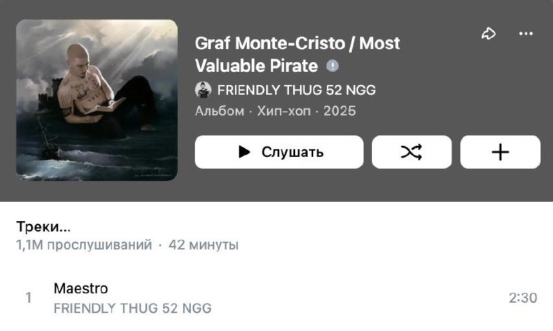 В ответ на пост 🎵 Альбом FRIENDLY THUG 52 NGG «Graf Monte-Cristo / Most Valuable Pirate» уже преодолел отметку в 1 млн. прослушиваний на официальном плейлисте VK На это ему потребовалось 14 часов. В дополнение к плейлистам VK: кажется, что теперь невозможно отслеживать точные стримы на плейлисте, а где-то вместо количества треков, оторбражается подпись «Треки...». 🔥 — Таг хорош! 😈 — VK, не лезьте в плейлисты, ну пожалуйста! @mainstreamusic