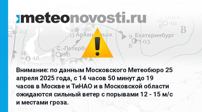 Внимание: по данным Московского Метеобюро 25 апреля 2025 года, с 14 часов 50 минут до 19 часов в Москве и ТиНАО и в Московской области