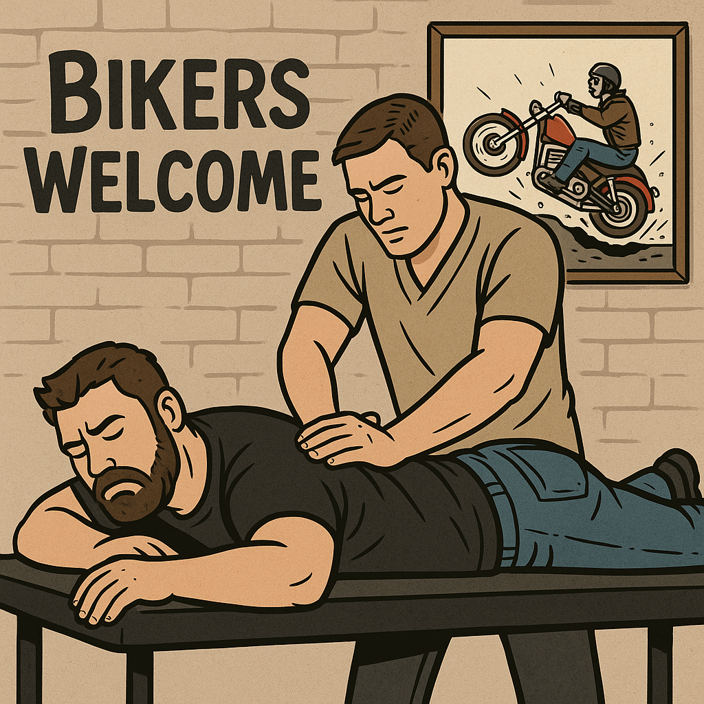 У мотоциклистов есть неписаный закон: железного коня нужно любить, холить и лелеять. Протереть фары, смазать цепь, подкачать шины, проверить тормоза — ритуал, почти как медитация. Но вот о себе парни часто забывают. А зря. Особенно те, кто катает на чопперах: ноги вперёд, задница почти на асфальте, спина как доска, подбородок смотрит на горизонт. Красиво? Да. Удобно? Пока дорога не напомнит, что она умеет быть "неровной" И вот ты летишь по трассе. Ветер в лицо, мотор поёт, будто AC/DC вживую. Душа парит над асфальтом. Но тут — раз! — яма. Без предупреждения, без шанса на манёвр. Каждый удар и позвонки встряхиваются, как книги на полке при землетрясении. Особенно на чоппере, где вибрации от руля до седла идут прямиком в позвоночник. Антенна боли. А вечером — шлем снят, куртка сброшена, лицо каменное. Садишься на диван, как ковбой после тяжёлой смены. И наступает момент истины: «Брат, я опять попал в яму...» — Глубокую? — Не знаю. Но позвоночник уже просит отпуск. И вот ты лежишь на
