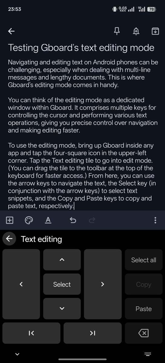 Можно подумать, что режим редактирования представляет собой специальное окно внутри Gboard. Он включает несколько клавиш для управления курсором и выполнения различных действий с текстом, что позволяет вам точно контролировать процесс навигации и значительно ускорять редактирование.