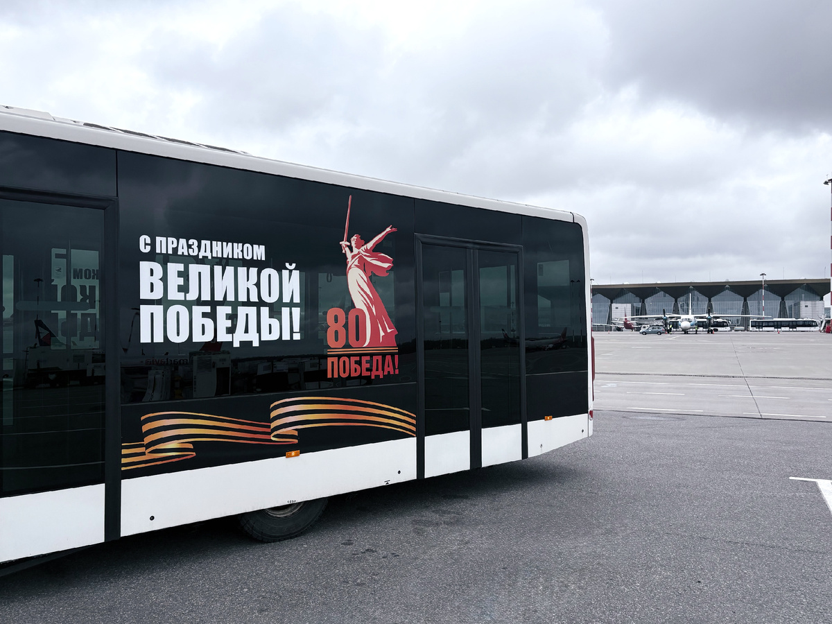 Автобусы с юбилейной символикой уже курсируют на перроне аэропорта Пулково 🚌 Брендирование транспорта ко Дню Победы — важная составляющая праздничных событий, цель которой — подчеркнуть важность памяти о героизме защитников нашего города и страны.