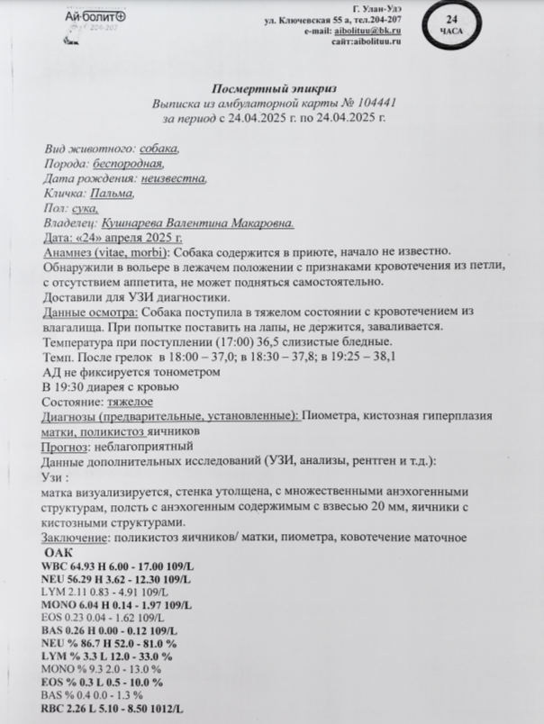 Здравствуйте друзья! Пальмушки с нами больше нет😪 Беги по радуге, наша девочка😪 Каждый из нас надеялся, но помочь ей не смогли😪, всем спасибо, что не остались равнодушны🙏 Как бы горько не было, у нас с вами за плечами, ещё очень много хвостиков, которых нужно кормить, греть, и спасать🙏 Пальму отвезли на операцию, привезли донора, но, к сожалению, ничего не помогло! Очень жаль Пальму, собачка не старая, ей бы жить да жить еще! Пальма была с отлова и не понятно, как стерилизована, если оказался такой диагноз! Матка и яичники оказались на месте! Собачка Пальма. Не спасли😭 24 апреля экстренно увезли на операцию собачку Пальму с внутренним кровотечением. Предоплата 25тр: •10.000руб Валентина Васильевна И. •15.000руб с пожертвований неравнодушных участников чатов Отчёт по АДРЕСНЫМ поступлениям на СБкарту Ольги ТОЛЬКО с пометкой что для ПАЛЬМЫ: 250 СВЕТЛАНА НИКОЛАЕВНА К 500 АНЖЕЛА ВАЛЕРИЕВНА З 500 НАТЭЛА ГРИГОРЬЕВНА Г 1200 ТАТЬБЯНА Б 100 НАТАЛЬЯ ГЕННАДЬЕВНА С 500 МАРИНА ИГОРЕВНА Л 500