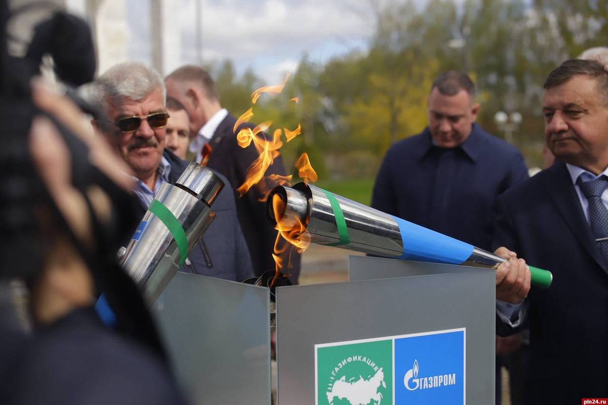 В Пушкинских Горах 25 апреля официально стартовала газификация районного центра. Торжественное мероприятие прошло у здания Научно-культурного центра, где собрались представители региональных и федеральных структур. Губернатор Псковской области Михаил Ведерников совместно с генеральным директором компаний «Газпром межрегионгаз» и «Газпром газификация» Сергеем Густовым дали старт подаче природного газа. Жители поселка Геннадий Обоенков, Людмила Фёдорова и Владимир Тимофеев символически зажгли факелы, обозначив начало новой инфраструктурной вехи в истории муниципалитета. На месте мероприятия была организована демонстрационная площадка с выставкой газового оборудования и работал мобильный офис АО «Газпром газораспределение Псков». Посетители могли получить консультации специалистов и ознакомиться с техническими характеристиками и стоимостью оборудования для дома. По словам главы Пушкиногорского района Оксаны Филипповой, пуск газопровода-отвода и газораспределительной станции «Пушкинские Го