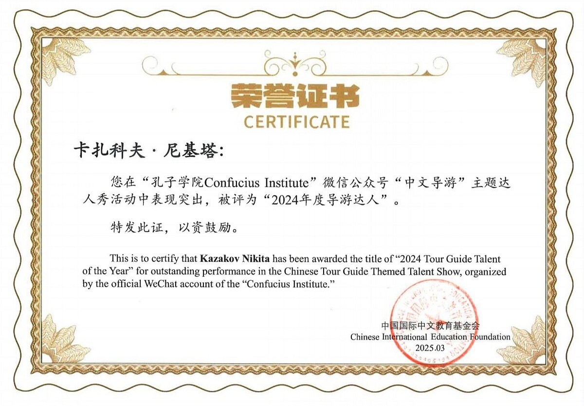 В честь 20-летия со дня основания сети Институтов Конфуция, официальный аккаунт Фонда международного образования КНР в социальной сети Weixin провел конкурс, в рамках одного из направлений которого – «Китайский гид» – участники со всего мира представляли свои видеоработы, посвященные достопримечательностям своих стран. Студенты 3 и 4 курса направления «Зарубежное регионоведение» Никита Казаков и Максим Панарин стали победителями в этом треке и получили титул «Гид-талант 2024». https://www.asu.ru/news/56996/