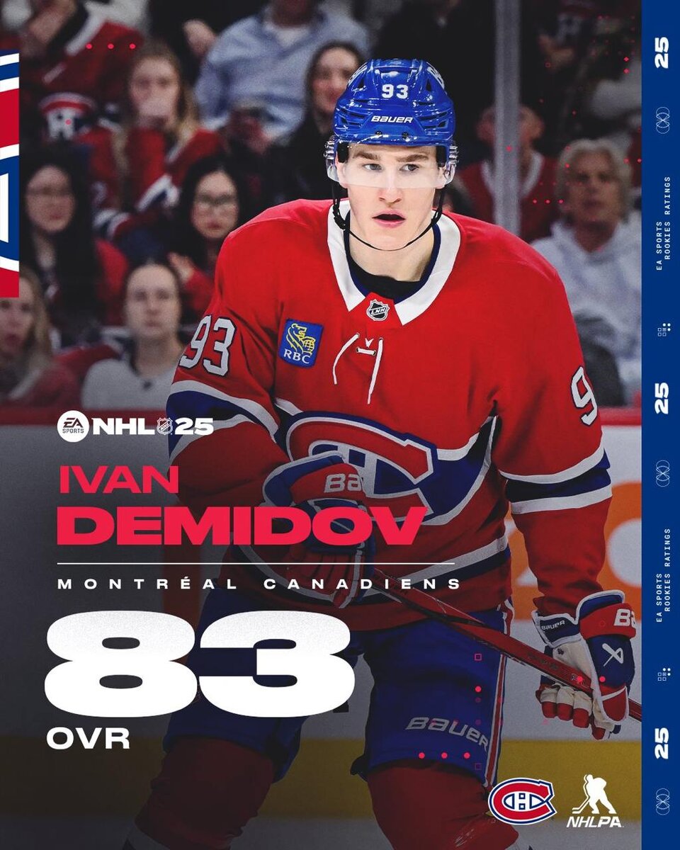 🎮Форвард «Монреаля» Иван Демидов получил рейтинг 83 в хоккейном симуляторе EA Sports NHL 25