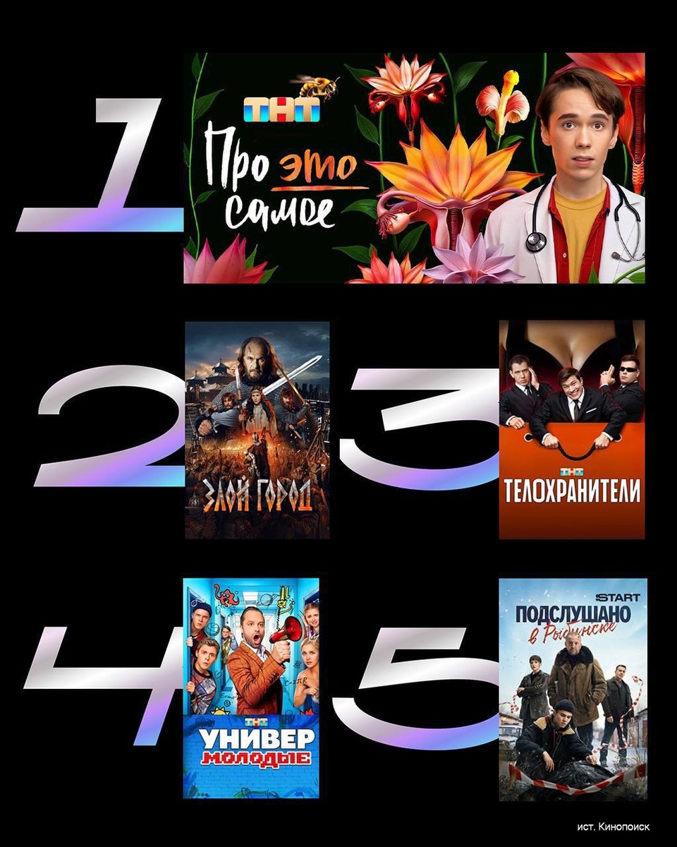 Российские проекты составили топ-5 обновлённого рейтинга самого популярного контента по версии «Кинопоиска» Самым просматриваемым проектом стал «Про это самое» (Norm Production). На втором месте рейтинга оказался «Злой город» (RB Production), на третьем — «Телохранители» (Norm Production). В пятёрку также вошли «Универ. Молодые» (Norm Production) и «Подслушано в Рыбинске» (1-2-3 Production). ☺ Подписывайся на SHOT 🙂 Прислать новость