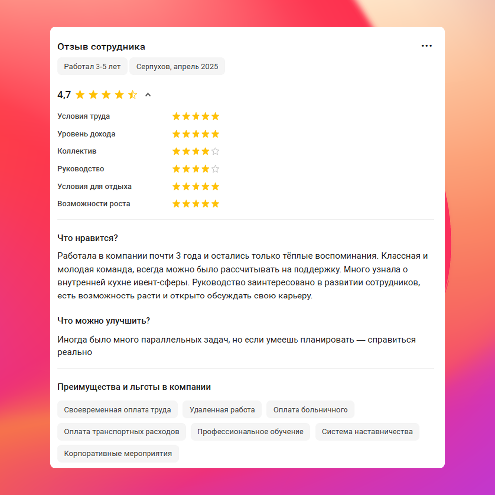Будущий коллега, ты попадешь в невероятно крутую атмосферу💫 Независимая оценка нашей компании на Dreamjob составляет 4,1. Это хороший показатель, выше среднего среди работодателей. Оценки поставили 83% действующих сотрудников. Нас хвалят за: