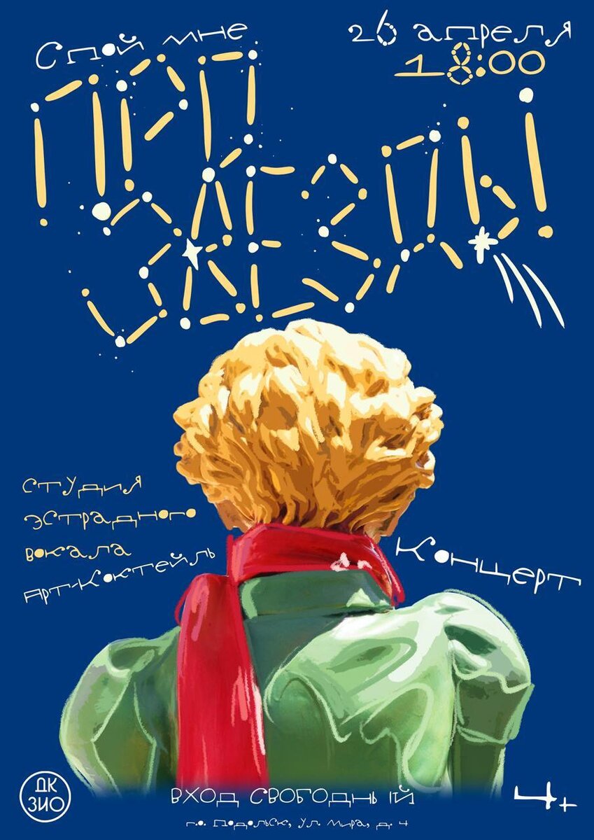 ✨ Отчетный концерт "Спой мне про звезды"! 🎤Выступит коллектив эстрадного вокала «Арт-коктейль»! 🌏🌹Зрителей ждут музыкальные композиции, вдохновленные тематикой произведения "Маленький принц". 🚫 Возраст: 3+ 📆 26.04.2025 🕒 18:00 🏢 ДК ЗИО 📍 г. Подольск, ул. Мира, 4 💰 Вход свободный❗️ #webПодольск ✅ Мероприятия Подольск https://dzen.ru/id/66ed500f7b5671493eca3fd6 http://vk.com/podolsk_events http://dzen.ru/podolsk_events
